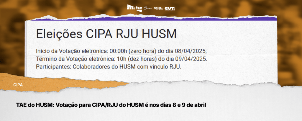 As votações para a CIPA/RJU estão acontecendo nos dias 8 e 9 de abril, de maneira online, de forma que contemple todos os turnos de trabalho. 📲 O link já foi divulgado, pela EBSERH e pode ser acessado clicando aqui. Mas atenção, APENAS TAEs RJUs do HUSM é que necessitam votar. Essa é a primeira […]