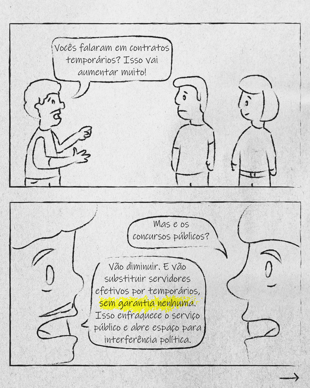 A PEC 32 permitirá que contratações temporárias sejam usadas mesmo para atividades permanentes, desde que consideradas de natureza “transitória”. Atualmente, esse tipo de contratação só é permitida em situações excepcionais, como a pandemia da COVID-19 (segundo a Emenda Constitucional nº 106/2020). Com a nova redação da PEC, as regras mudam: